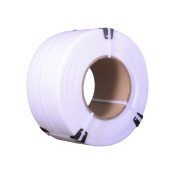 по запросуПолипропиленовая лента белая, ширина — 15 мм, толщина — 1,0 мм. Размер втулки — 200 мм, длина намотки — 1200 метров. Сила разрыва — 360 кг.